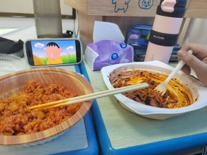 这天中午也是弥补了从第一天开始的小遗憾呀!那就是拍一张一起吃饭饭的照片!有句话怎么说的,爱就是一起吃很多顿饭饭!那如果在饭饭的时候加上蜡笔小新岂不美上加美!罗森的饭饭和面都很好吃。但素20块钱一碗的面有点少,差评。