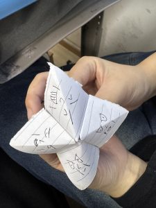 这是第六天两个小学生叠的东南西北,只不过变成了我自创的四个大叔,里面写了ABCD,用来蒙英语选择题还挺好,准确率还挺高怎么回事。但是也是从这天开始两个人变得越来越像小孩!在诺诺面前也是无所掩饰的呀!